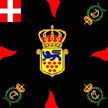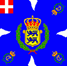 The flag was light blue with red flames and coat of arms as follows: shield parted per fess: above at dexter Or three lions passant Azure in pale surrounded by nine heartlets Gules (for Denmark),