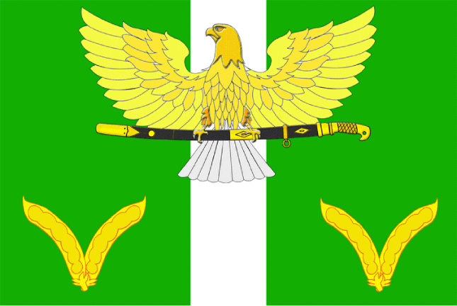 On a green field with a narrow silver column, above everything, at the top, there is a golden eagle with outstretched wings and a silver tail, holding in its claws a Cossack saber with a golden hilt in a black, gold-decorated scabbard, with the hilt to the left and the blade down, accompanied in greenery below by paired soybean pods, connected at the base and diverging archedly upward and to the sides.