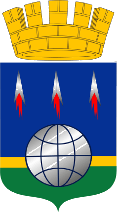 On an azure field with a green, gold-bordered tip, above all, a lowered silver globe with a conventional azure grid of coordinates, above which, in a belt, are three silver arrowheads with red flames instead of sockets. The shield is surmounted by a municipal crown of the established pattern.