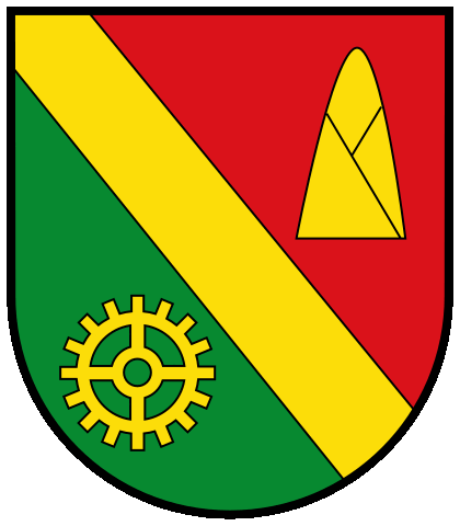 From the communal website: The arms were granted in 1996. The new emblem of the settlement, first documented in 1321 as Heureb, reflects the key elements that have shaped the economic life of its inhabitants, both past and present. The sugarloaf symbolizes the beet sugar factory founded in 1850, which marked the beginning of the transformation of this predominantly agricultural community into one of the most important industrial centers in the Mattersburg district during the interwar period. The four-spoked golden wheel can be interpreted as a symbol of the thriving commercial sector in recent times.