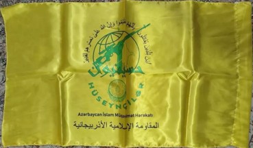 Found at https://www.middleeastmonitor.com/20211009-the-huseynyun-irans-new-irgc-backed-movement-in-azerbaijan/, a yellow-field flag of the "Huseynyun" (the "Huseinites"). "Huseynyn" (حسينيون) can be read in the middle, at the bottom of the arm holding a rifle. It is a Shia-Muslim Islamist militia backed by the IRGC (Iranian Revolutionary Guard Corps); c. Sept. 2021. IRGC's Quds Force has been active in southern Azerbaijan since the early 1990s. Although Iran and neighboring Azerbaijan both have Shia-majority populations, the Iranian government perceives that Azerbaijan's sectarian-oriented government is not revolutionary enough in supporting Shia-sharia theology. A photo shows the Huseynyun flag draped atop IRGC Quds Force commander Gen. Qasem Soleimani's tombstone.
