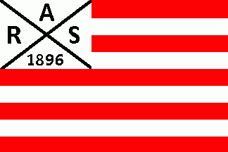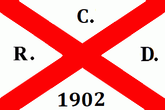 The white flag was parted by a red saltire with black inscriptions on every quarter as follows: "R."(hoist), "C."(top), "D."(fly) and "1902"(bottom).