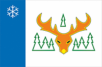 The flag is similar to the coat of arms, but with visible changes. On the left is a blue strip representing the sky, with a snowflake at the top of the strip. To the right of the strip is a big snowy area with the deer head in the middle. This time however it is more golden, with a yellow nose, eyes outlined in yellow, and the head being outlined in yellow and green. Above and to the sides are the same seven trees, but with a white core and a dark green outline.
