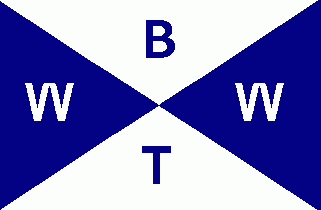 The flag is parted per saltire of dark blue and white with inscription in counterchanged colours as follows: "W" (hoist and fly), "B" (top) and "T" (bottom)
