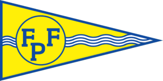 The pennant is yellow fimbriated light blue. Shifted to hoist on a yellow disc fimbriated light blue is a blue inscription "FFP" ordered 2:1. he disc is superimposing a bar wavy of seven alternating waves of blue and white.