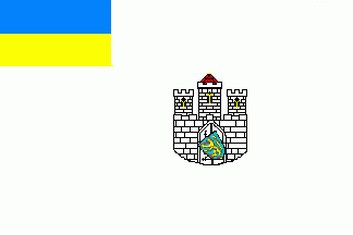 The 1st flag (see right image above) was white with the castle from the city arms without shield slightly shifted to fly and a blue-yellow horizontal bicolour in canton.