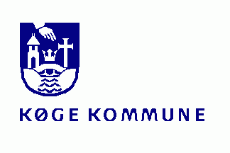 The logo flag is white with a dark blue logo version of the coat of arms at hoist and a centred dark blue inscription "KØGE KOMMUNE" at bottom.