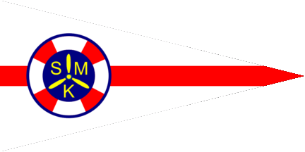 The pennant is white parted by a red horizontal stripe. Shifted to hoist is a blue disc with a yellow ship propeller, flanked by yellow initials "SMK", all surrounded by a red and white lifesaver fimbriated blue.