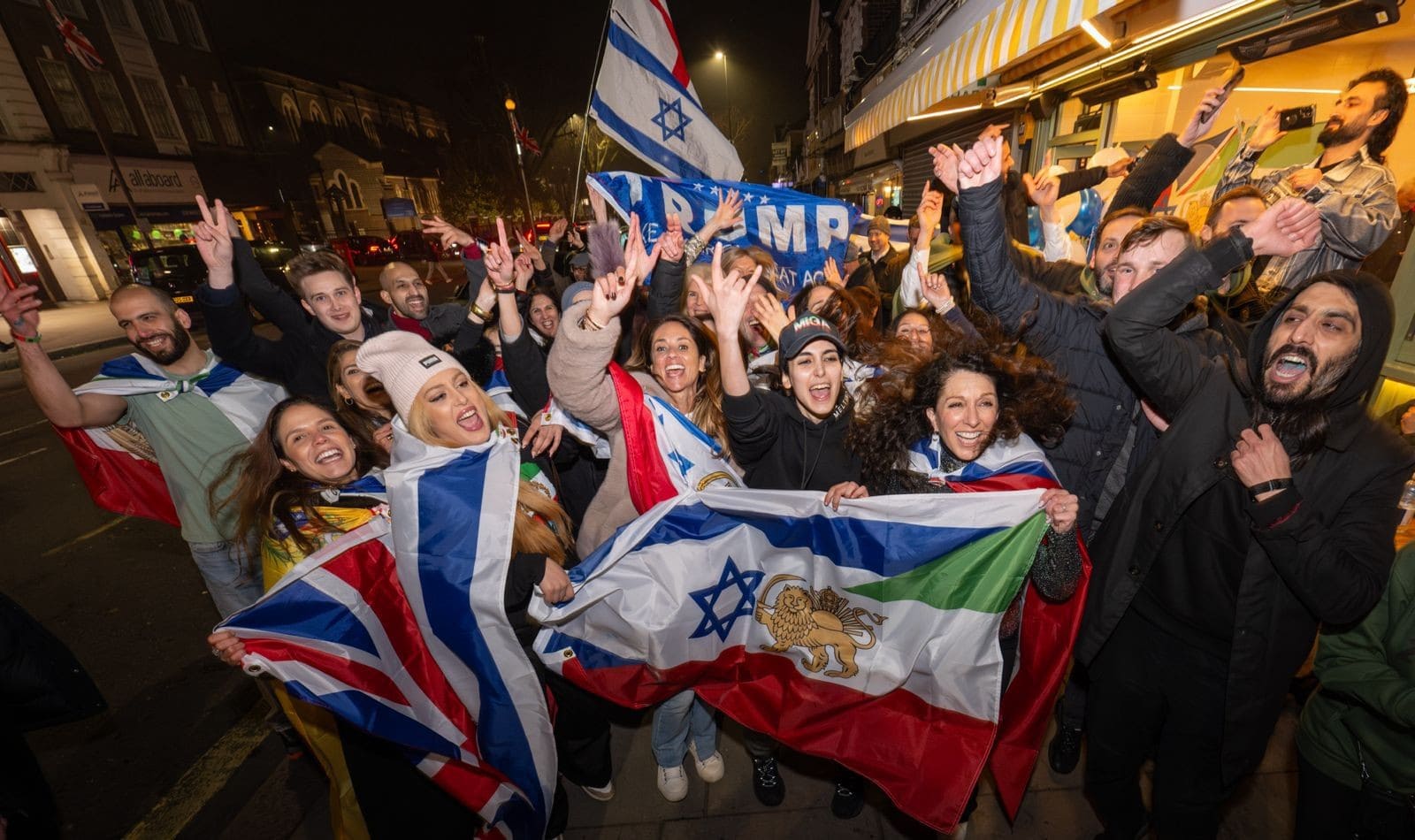 Israel-Iran friendship flag (Iran flag with state emblem before 1979). Seen in Golders Green, Barnet, N. London, England, early March 2026.