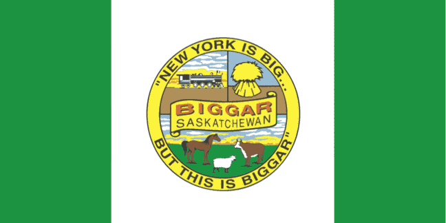 The flag of the Town of Biggar, Saskatchewan, consists of three vertical stripes green-white-green with the town emblem in the center of the white stripe. Seal-like emblem shows local scenes - a locomotive, a wheat, and a horse, a cow and a sheep, including a ribbon inscribed "BIGGAR / SASKATCHEWAN", all that encircled by the words "NEW YORK IS BIG / BUT THIS IS BIGGAR" Photo of the flag courtesy of Kathy Sarvas, Clerk Steno - Town of Biggar