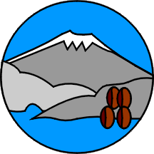 The logo itself is circular and shows a sloped seaside landscape in shades of light blue and greys, with a snow-covered peak and four brown coffee beans at the observer’s right in foreground, stacked 2+2. All items outlined in black.