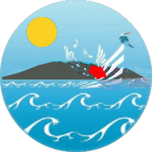 The circular shield is cyan (light blue), sky over sea, the latter with white waves, an black island on the horizon under a yellow sun, and in the forground a very stylized paper boat, carrying a large red hibiscus flower, with a kingfisher perched at its prow, and issuing a waft of white musical notes.