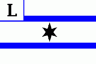 The 1st flag (see left image above) displays a black 6-point star between two horizontal blue stripes. In canton is a black initial "L" separated by thin blue lines. The 2nd flag (see right image above) has the same pattern but completely in brownish red.