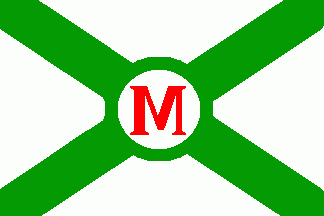 The white flag was parted by green saltire, on centre was a red "M" in a green annulet.