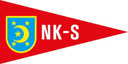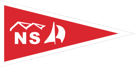 The pennant is red either cotized white-red (see left image above) or fimbriated white (see right image above). Shifted to hoist is a white inscription "NS" under two gables (of a boat house).