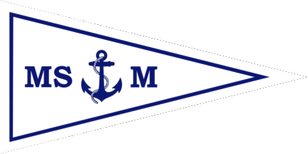 The pennant is white cotised blue-white, shifted to hoist is a blue fowl anchor in pale, flanked by blue initials "M" and "S" (see left image above)