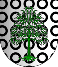 The municipal webpage shows a similar image. Even though other details agree (as the number of towers, and the scroll style), the semy background is drawn differently, showing sets of two concentric rings, lined in slightly lighter grey, not thick black rings; the pattern is the same, though: 5×3 fully visible plus more partially so at the sides and (barely) at the bottom, in a rank-and-file, not staggered, array; the details of the tree seem different as well.