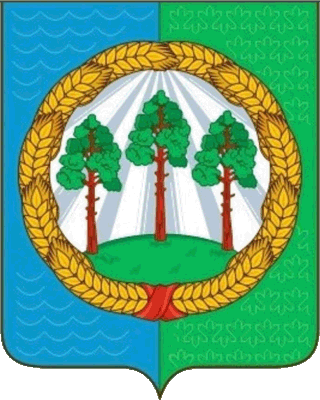 In an azure and green dissected field - a golden round closed wreath of ears of corn, tied at the bottom with a scarlet ribbon and filled with silver, in which - on a green ground - three green pines with scarlet trunks and branches, with the middle pine elevated.