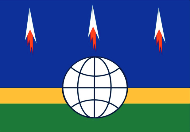 A rectangular cloth with a width to length ratio of 2:3, consisting of three horizontal stripes, from top to bottom: blue with a width of 2/3 the width of the cloth, yellow with a width of 1/9 the width of the cloth, and green with a width of 2/9 the width of the cloth; in the center of the cloth, shifted downwards, is a white globe with a diameter of 1/2 the width of the cloth, and a conditional grid of coordinates in blue, above which, on a blue stripe, are three white arrowheads with red flames instead of bushings.