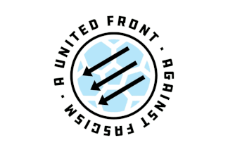 For the supporters of Minnesota United FC (MNUFC), anti-Fascism is an important part of the club culture and is very visible in their performances from the stands. As a part of the greater AIF network, they go under the name A United Front Against Fascism, with a very specific emblem: three black arrows of the Iron Front over a representation of soccer ball in blue and white, within a black circle, all surrounded with the name of the movement inscribed in black uppercase letters. The flags charged with this emblem are white.