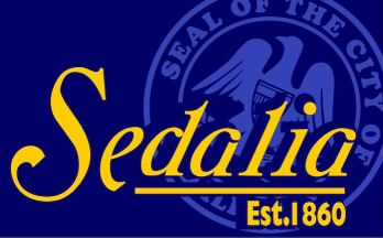 The previous flag of Sedalia, used before the flag adopted in 2021, was the city's name and date of establishment in gold over a tilted, partial light blue city seal on a dark blue field.