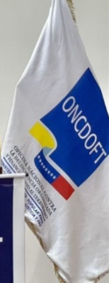 The logo is a square, divided by a wavy 3D band having gray as its shadow in the National Colors inclduing the stars; over the square reading ONCDOFT. Underneath all of this, it reads OFICINA NACIONAL CONTRA DELICUENCIA ORGANIZADA Y FINANCIAMIENTO AL TERRORISMO with a bar underneath; under this as the full version, it reads MINISTERIO DEL PODER POPULAR PARA RELACIONES INTERIORES, JUSTICIA Y PAZ the Ministry it is a part of.
