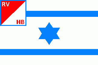 The canton had a blue bordure and was parted per bend sinister of red and white with white inscription "RV" on red part on upper hoist corner