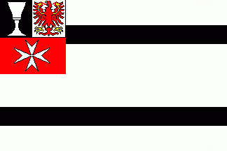 The flag is divided per bend sinister into red and white. In the red partition are the initials in Gothic letters, connected to a logo. In the white partition is a crowned red eagle, having an inescutcheon, probably the lesser arms of the Electorate of Brandenburg.