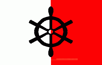 The guild is based in Berlin and has bases at five Berlin sailing clubs. The flag is vertically parted of white and red with a black steering wheel on centre.