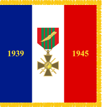 "Avranches has been awarded the "1939-1945 War Cross with Palm" on June 2, 1948. Since the entire town was being honored, the decoration could not be worn on an individual's uniform; the only way to display it was to place it on a flag. However, no such flag existed, and nothing highlighted this recognition. Therefore, Jean-Louis Godey, secretary of the National Union of Veterans of Avranches, undertook the creation of a new flag for the town of Avranches. Against the tricolor background of the national flag, on one side is the Croix de Guerre with the bronze palm awarded to the City, displayed on the side which is adorned with the head of the Republic, and on the other, its coat of arms below its name. The edges are highlighted with small fringes. Square in shape, it measures 90 by 90 cm. It was produced by the Majino company. Unlike other flags used during patriotic ceremonies, the Avranches flag is neither an association's nor a state flag: it is a municipal flag. Only the mayor or an official representative of the municipality can decide when and for what purpose it is used."