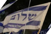 A flag mimicking the Israel national flag by replacing the Shield/Star of David or "Magen David" in the center stripe with the Hebrew word "shalom" or "peace", with the slogan "Shalom Achshav" ("Peace Now") at left on the bottom blue stripe, along with a logo representing the 70th anniversary of the founding of the state of Israel (with the "Magen David" being incorporated into "70"). (Source: https://www.peacenowcanada.org)