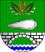 Shield Vert with base wavy of Argent and Azure a slab Argent, on chief a corn cob Or between two rye ears of the same, all tied Argent, issuant from base wavy a throughout bridge Argent masoned Sable. Mural crown Argent with three visible towers (village rank) and white scroll reading in black upper case serifed letters "MOURA MORTA - CASTRO DAIRE".