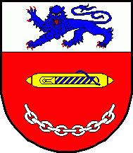 Shield Gules a weaver´s shuttle Or in fess with yarns Azure, on base a part of a chain Or, chief Argent charged with a lion passant guardant Azure armed and tongued Gules. Mural crown Argent with three visible towers (village rank) and white scroll reading in black upper case serifed letters "MEZIO - CASTRO DAIRE".