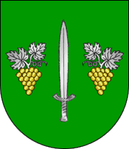 Shield Vert a sword Argent in pale, flanked by two grape bunches Or leafed Argent. Mural crown Argent with three visible towers (village rank) and white scroll reading in black upper case serifed letters "PASSÔ - VILA VERDE".