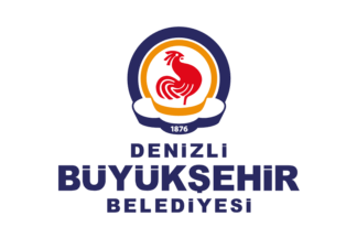 The flag of Denizli, used either horizontally or vertically (photo, photo), is white with the municipality's emblem. "Büyükşehir Belediyesi" means "Metropolitan Municipality".