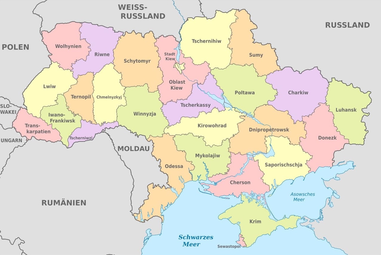 To make things worse, there are separate Russian names for most Ukrainian toponyms, that may differ more than just in orthography: and good example is the capital Kiev, spelt "KNEB" in Russian (with "kee-yev" sound) and spelt "KNIB" in Ukrainian (with "k*yeev" sound – "*" is an accented schwa) – in what would be spelt "KbIN~NB" in Russian, if instead of a assimilated name it would be a simple transcription.