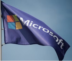 Microsoft uses white or blue flags with the Windows logo and the Microsoft name in gray or white.