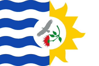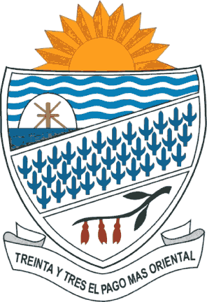 The coat of arms of Treinta y Tres was created by José Gorosito Tanco, being designed for the 75th anniversary of his former school Santa Catalina de Sena in 1955. Underneath the shield, a ribbon reads TREINTA Y TRES EL PAGO MAS ORIENTAL [Treinta y Tres, the Easternmost Countryland]. The shield is diagonally divided into three sections. The uppermost section depicts a background of 9 alternating stripes of white and blue, reminiscent of the national flag. The four stripes are for the Cebollati, Olimar, Yerbal, and Laguna Merín streams. A coast by the Olimar River is seen, as well as a white circle which depicts over it a sword with two spears crossed together behind it, serving as a reminder of the Spanish and Indian origins of the people. The central section depicts the points of the spears of the Thirty-Three Orientals in blue, from whom the name is derived. The lower section depicts a branch from which three ceiba flowers emerge as a national flower. Serving as a crest to the shield is a sun, also reminiscent of the national flag.