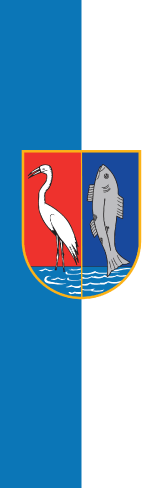 The emblem presented here (flag and CoA) and on Wikimedia differ in some details. On the flag the egret is turned outwards, away from the fish and towards the hoist, while on the Wikimedia emblem it's turned towards the fish. The fish on Wikimedia has scales, while on the flag he hasn't. On the flag's emblem the base is depicted as two wavy water surfaces, but not so on Wikimedia. The version with the water is prevailing in the public (and on the municipality's Facebook page), e.g. see here, here (source) and here (source). The Wikimedia variant has, at best, a certain ghost rider existence, like here (source).