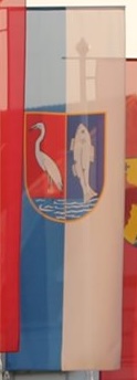 differ in some details. On the flag the egret is turned outwards, away from the fish and towards the hoist,
