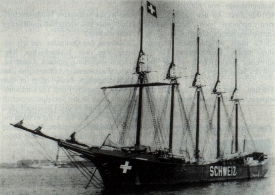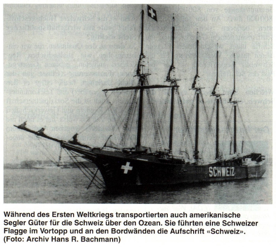 During the First World War [...] the Swiss government and some private entrepreneurs tried to negotiate several charter agreements or outright ownership of ships under neutral flags. [...] In march 1917 the Swiss Federal Council established a central authority to handle all import and export problems, called FERO. [...] FERO managed to close a contract with the US War Transport Office ensuring the delivery of grain to Switzerland via European neutral ports. The cargo was carried on US flag vessels, including even some sailing ships. The ships were required to carry a stretched out Swiss flag on the foremast. Also the word "SCHWEIZ" (German for Switzerland) in huge white letters was painted on both sides of the hull [see photo above]. [...] When the USA entered the war against the Central Powers these ships were of course no more available. [...] However, after the cease-fire in November 1918 a great number of ships became available and the blown up freight rates plummeted to a rather low level. [...]
