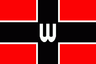 The red flag was parted by a black centred cross fimbriated white with white stylised "W" on centre.