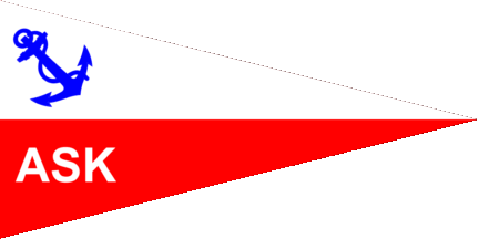 The pennant is horizontally divided of white and red. At hoist is a blue anchor in bend above and a white inscription "ASK" below.