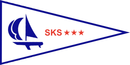The pennant is white fimbriated blue, shifted to hoist is a blue sailing boat and at fly a red inscription "SKS" with three annexed red dots.