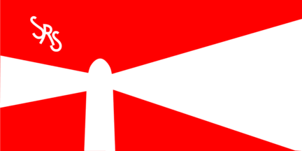 They are red with a white lighthouse with rays on either side and a stylised white inscription "SRS" in canton.
