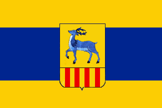 The new flag was approved on May 14, 2018, and was published in the Diari Oficial de la Generalitat Catalana nº 7708, dated September 10, 2018: Yellow flag, with the dark blue deer of the shield, 3/4 of the height of the cloth, in the center; proportions 2:3.