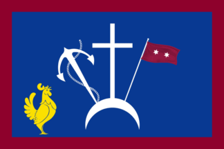 The flag of Kassandra dark blue, edged maroon, with a montage of a white cross on a cresenct, and anchor and a flag with two white stars on maroon on a pole. In the lower hoist is a yellow rooster. It is the historical flag of the Kassandra rebels from 1821.