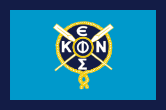 The flag of the Hellenic Rowing Federation is blue, bordered dark blue, with the federation's emblem in the center.