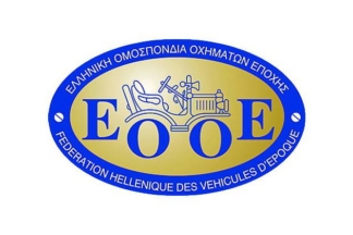 The flag of the Hellenic Federation of Vintage Vehicles is white with the federation's emblem in the center.