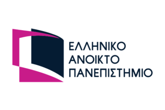 The flag of the Hellenic Open University is white with the logo in purple and dark blue.
